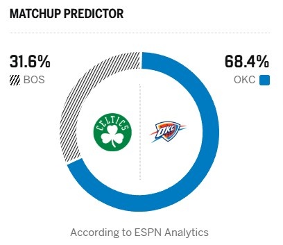 ESPN给出本场胜率预测,雷霆高达68.4%,凯尔特人仅为31.6%。